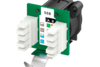 Panel mount RJ45 receptacle, IDC 110 punch down terminals, A-Series cutout with latch lock system, max. panel thickness 3 mm. Mounting screws included.