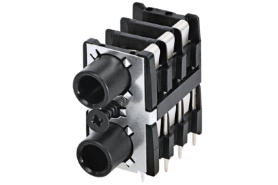 - Stereo dual slim jack socket for PCB mounting with switch contacts